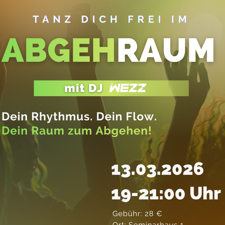 Du, die Musik und dein Gefühl. Tanz dich frei im Abgehraum. Mit Live Musik von DJ WEZZ aus den Niederlanden. Begleitet wird der Abgehraum von Damaris Hahne. Sie führt uns durch den Abend: Vom entspannten Warm-up bis hin zur wohltuenden Entspannungsübung zum Abschluss.